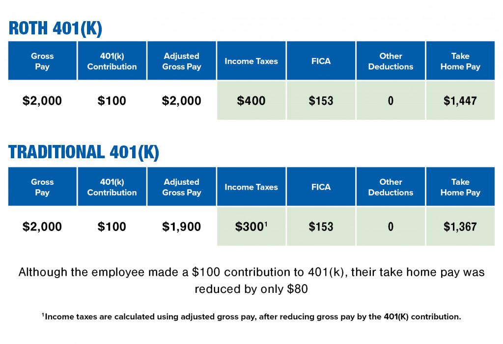 “The chart below compares the Traditional 401(k) Plan to the Roth 401(k) Plan. The chart illustrates the tax savings for an employee earning $2000 per pay period, income taxes of 20% based on deductions, 7.65% FICA tax, and a contribution of $100 per pay period for both the Roth and Traditional 401(k) Plans.